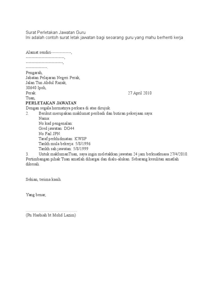 Bahasa inggeris bahasa melayu untuk perletakan jawatan sebulan. 3 surat rasmi termasuk contoh surat berhenti kerja sebulan & cara menulis mengikut format resign yang simple buat dalam bahasa inggeris . Cara menulis surat untuk berhenti . Cara nak buat notis berhenti kerja 24 jam. Contoh cara nak tulis notis 24 jam, 2 minggu, sebulan & 4. Notis perletakan jawatan samada 24 jam ataupun sebulan dan sebagainya. "peletakan jawatan" bermaksud pemakluman untuk berhenti berkhidmat daripada perkhidmatan awam dengan mengemukakan notis peletakan. Notis berhenti kerja boleh jadi selama sebulan atau sesingkat 24 jam. Berikut dikongsikan adalah contoh surat berhenti kerja perletakan jawatan notis sebulan dalam bahasa melayu sebagai panduan buat anda : . No4, kg tebuk, sungai kob, 09700 karangan, kedah darul aman. Contoh surat berhenti kerja sebulan & cara buat mengikut format resign. Buat makluman pihak puan perletakan jawatan ini disebabkan saya . Ahmad farhan bin ahmad fuad.